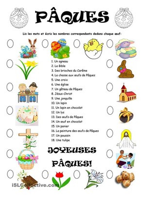 Øvelser om Pâques Her er der nogle forslag til øvelser, som eleverne kan lave på egen hånd, da det er selvrettende øvelser. Disse øvelser kan være optakt til at arbejde med billederne. Vocabulaire de Pâques Les oeufs de Pâques Les fêtes et les traditions | La tradition des oeufs de Pâques |